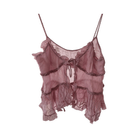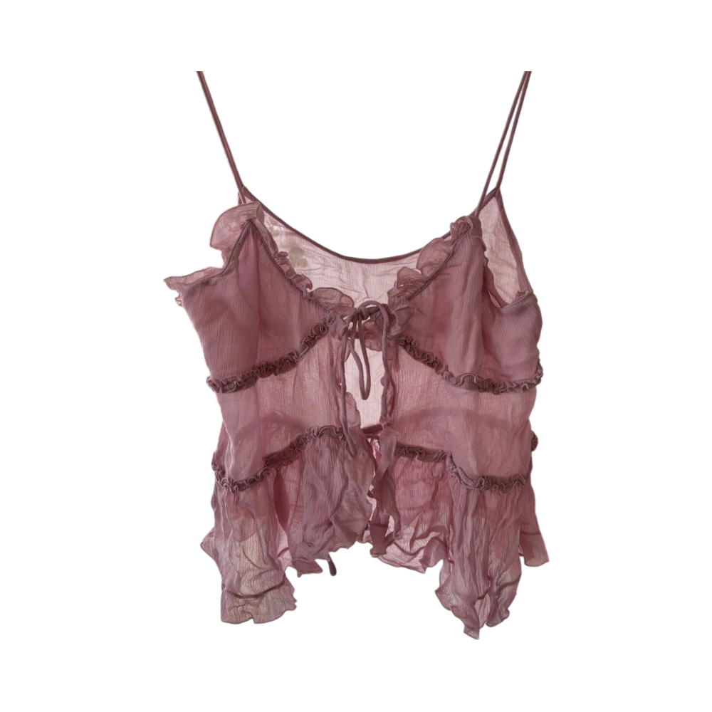 Hento vaaleanpunainen röyhelötoppi. Koko lappu leikattu sillä näkyi paidasta läpi (läpikuultava kangas) mutta muistaakseni xs. Paidassa pientä kulumaa sillä haurasta materiaalia.