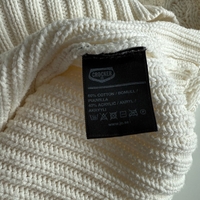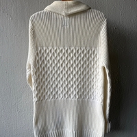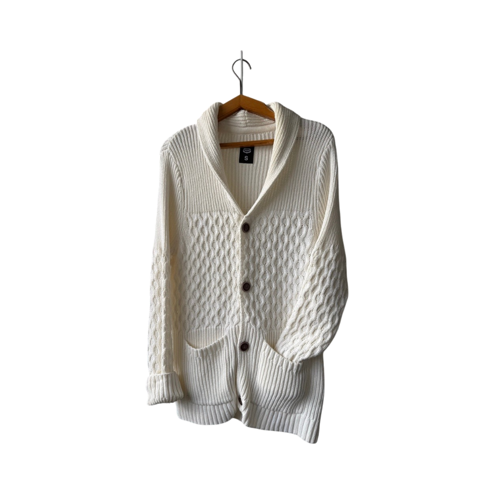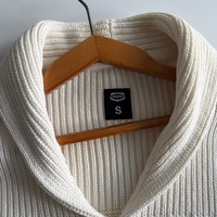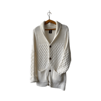 Luonnonvalkoinen neuletakki. Pitkähkö malli, edessä nappikiinnitys. Koko S, kainalo-kainalo 51 cm ja pituus 77 cm. Materiaali puuvillaa ja akryylia.