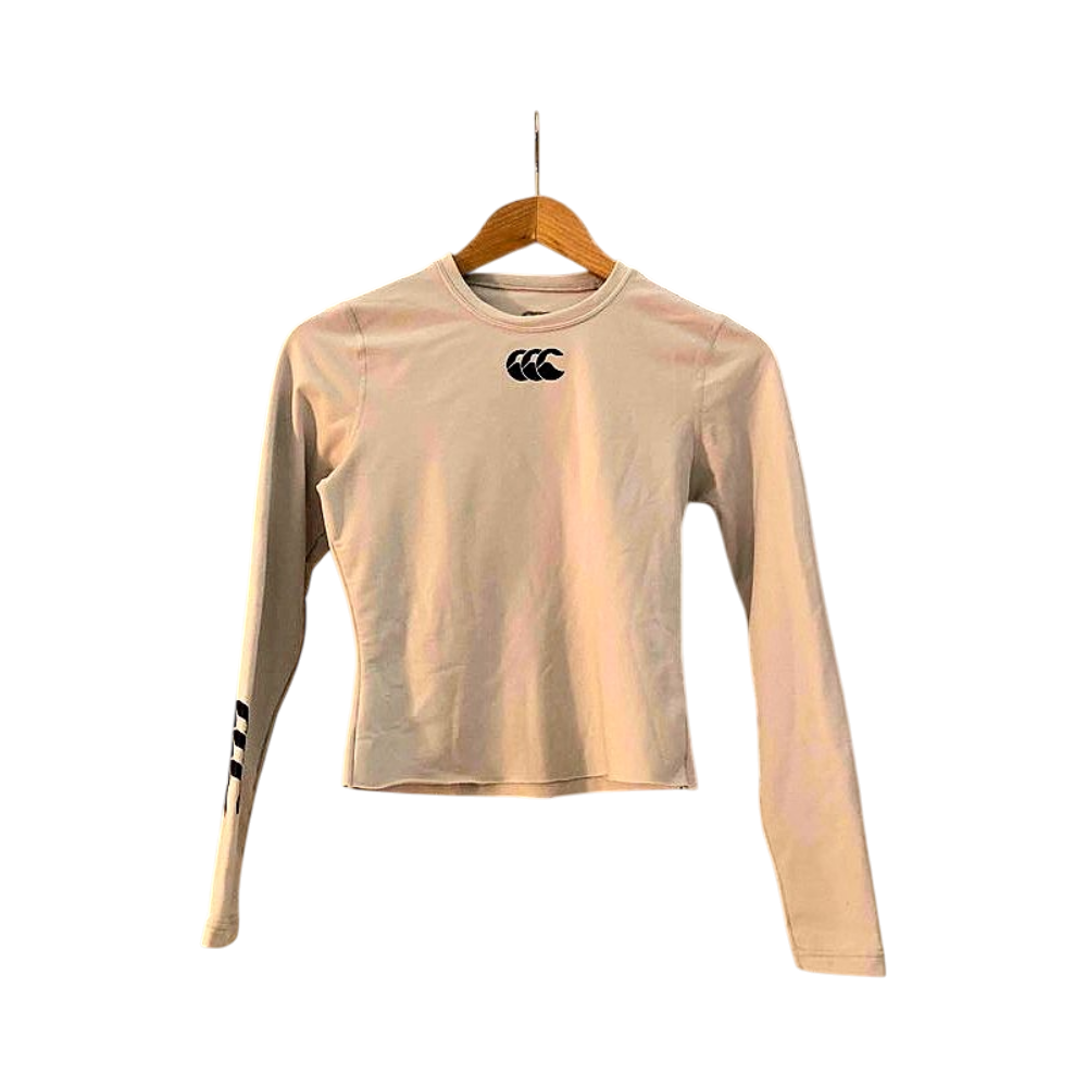 Thrifted rash guard cropped to waist-length. Super cool details. Light gray. Worn as a long-sleeved top