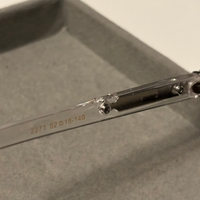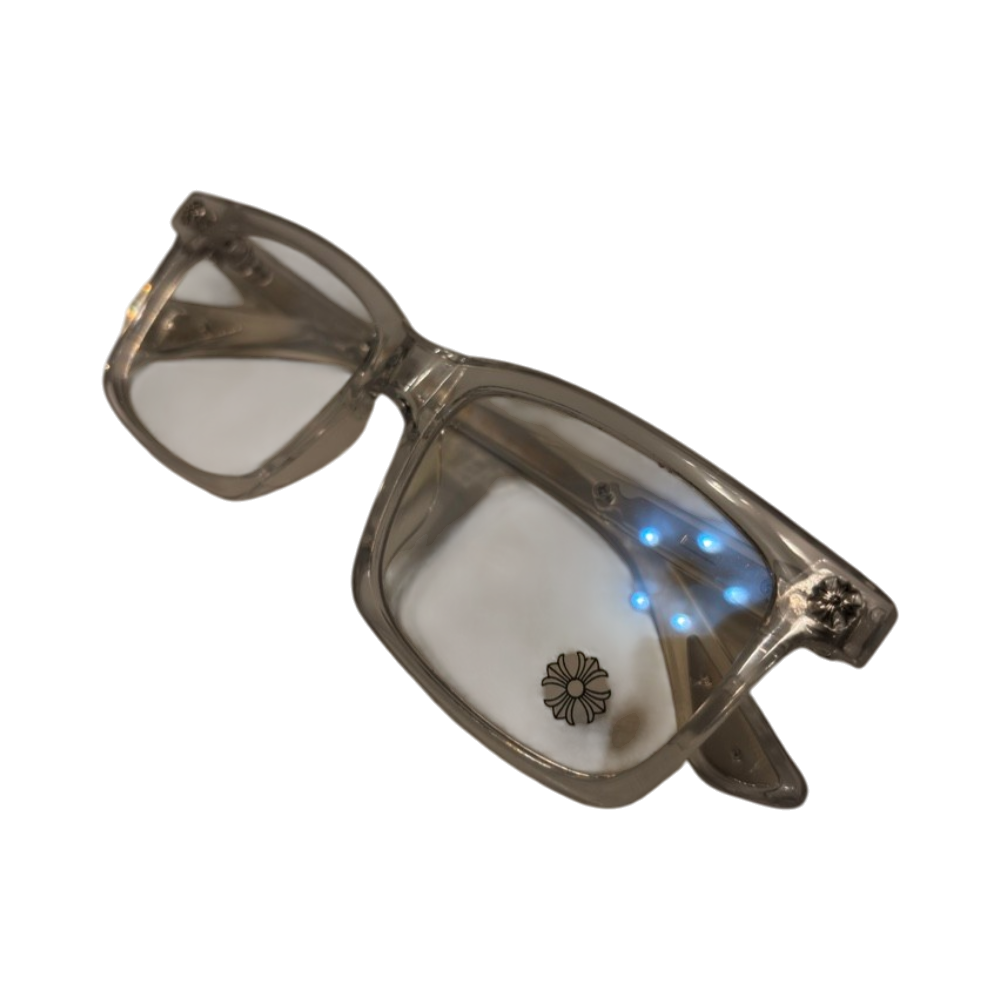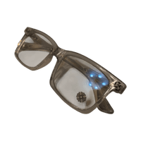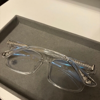 Transparent square-frame eyeglasses, lightweight plastic frames.
