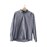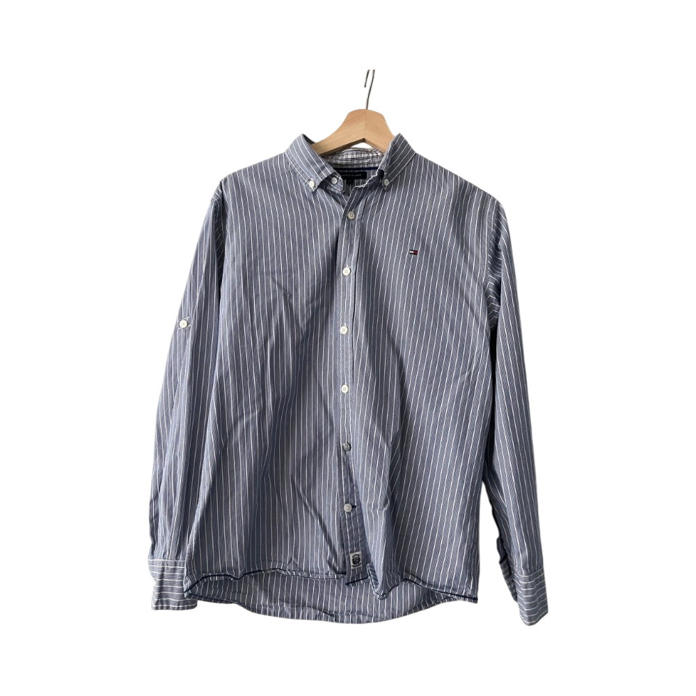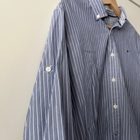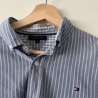 Sini-valkoraidallinen Tommy Hilfiger kauluspaita. Materiaalilappu leikattu, mutta on 100% puuvillaa. Hihat saa myös lyhennettyä. Koko lasten 16 eli vastaa XS-S. Kai-kai n. 45 cm.