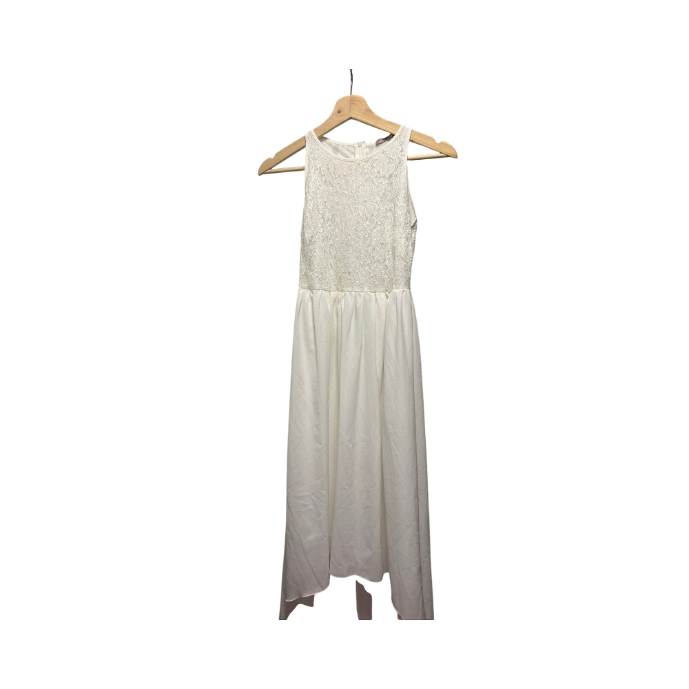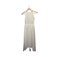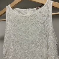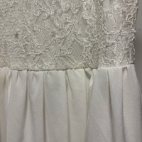 Hihaton valkoinen mekko, pitsiyläosa ja laskostettu helma.