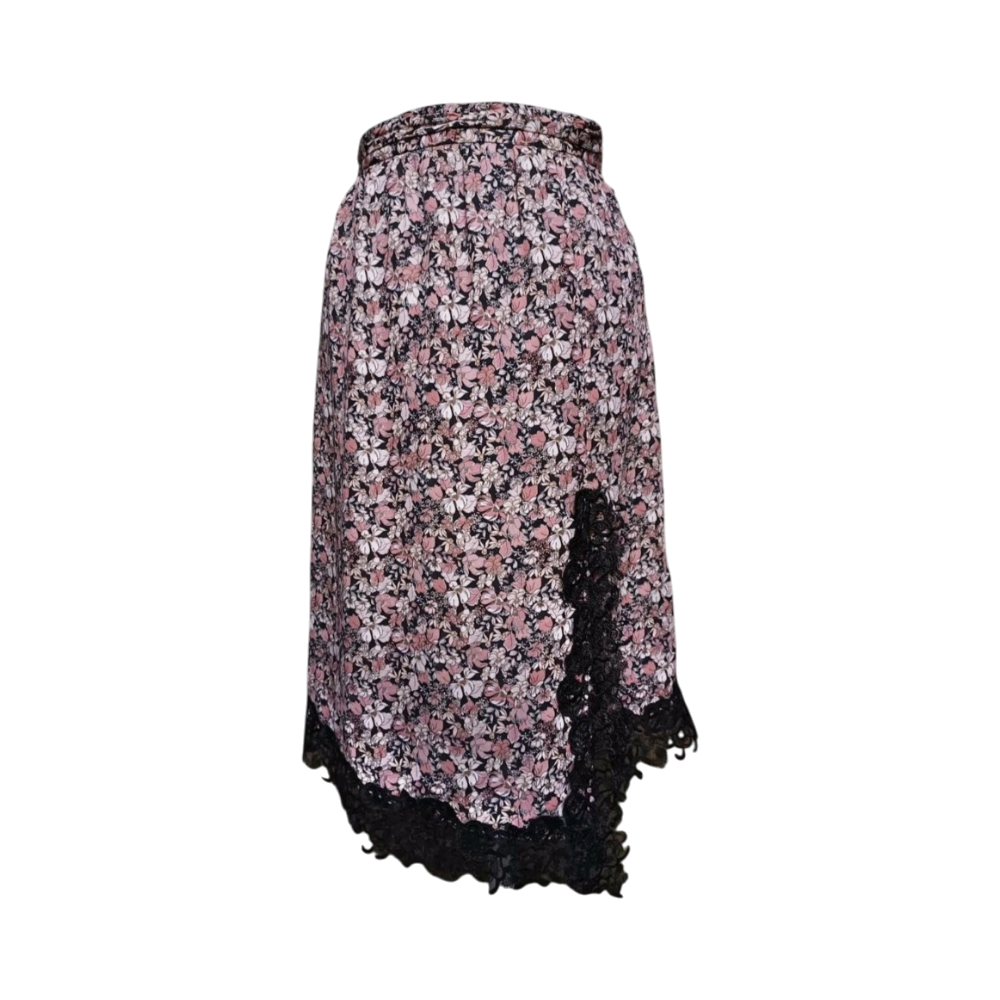 Brand PINKO “Damsquare” floral skirt, never worn, with original tags attached. Made from lightweight double georgette fabric with a romantic pink and black floral print and delicate black lace trim along the hem. Elegant midi length with a flattering silhouette — perfect for both casual and dressy occasions.