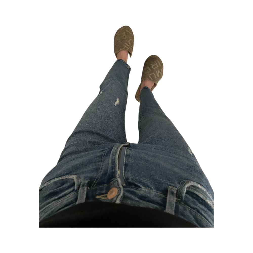 Erittäin hyväkuntoiset tummansiniset farkut koossa 34. Materiaali: 99% puuvillaa, 1% elastaania. Oon 168 cm. Mitat näkyy kuvissa. Housujen pituus vyötäröltä lahkeeseen 93 cm.