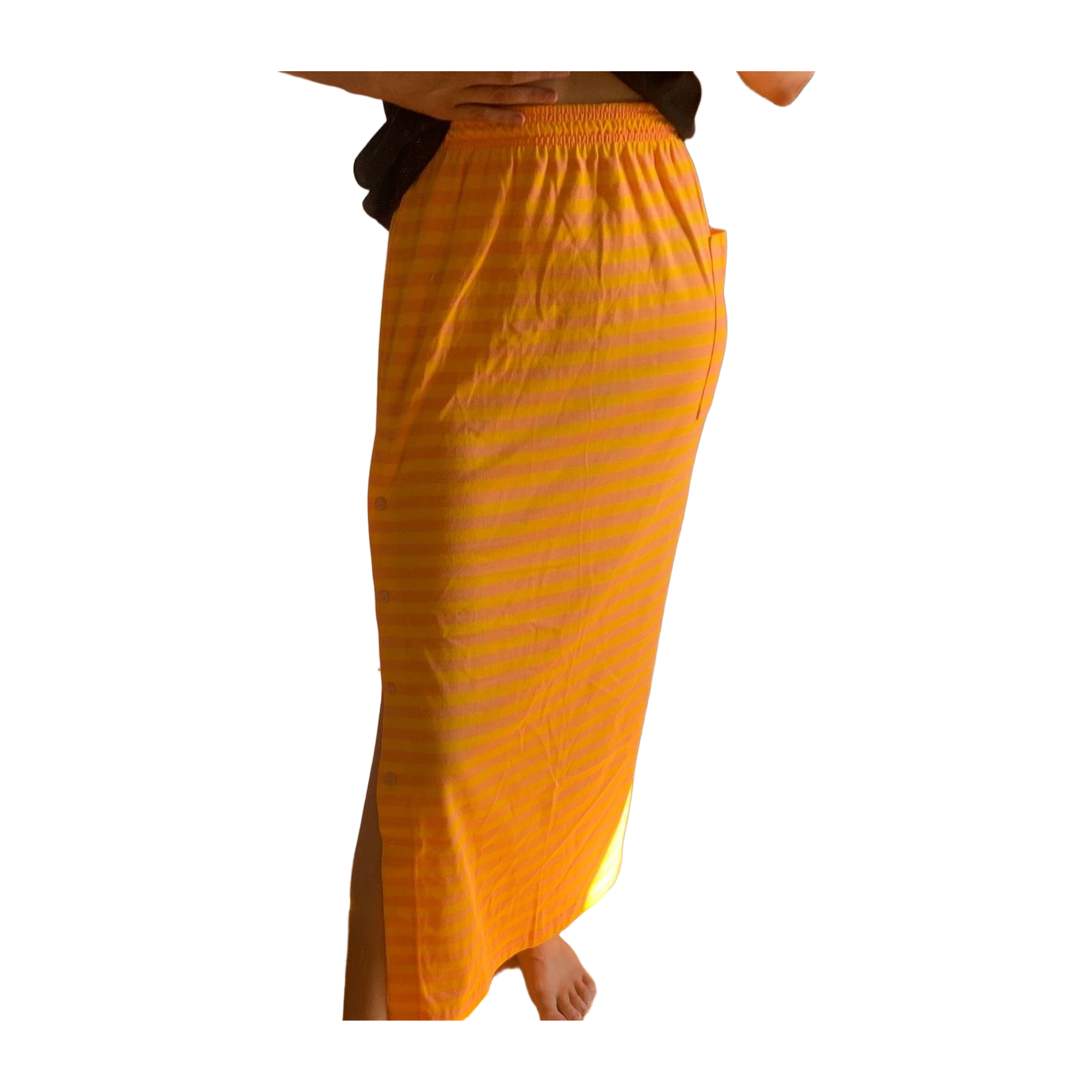 Tosi kiva raitahame. Kokolappu puuttuu, mutta kuvassa xs-s kokoisen päällä. Vastaa parhaiten mielestäni s. Joustava vyötärö.