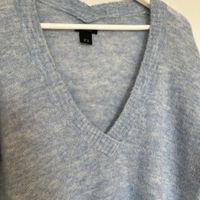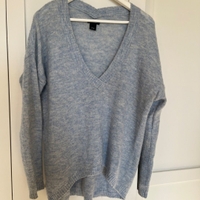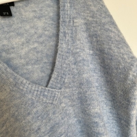 Vaaleansininen villaneule (sis. Mohair). Takaa hieman pidempi. Käytetty mutta hyvässä kunnossa edelleen.