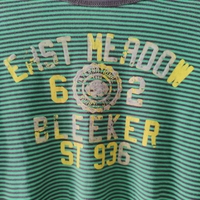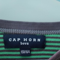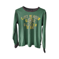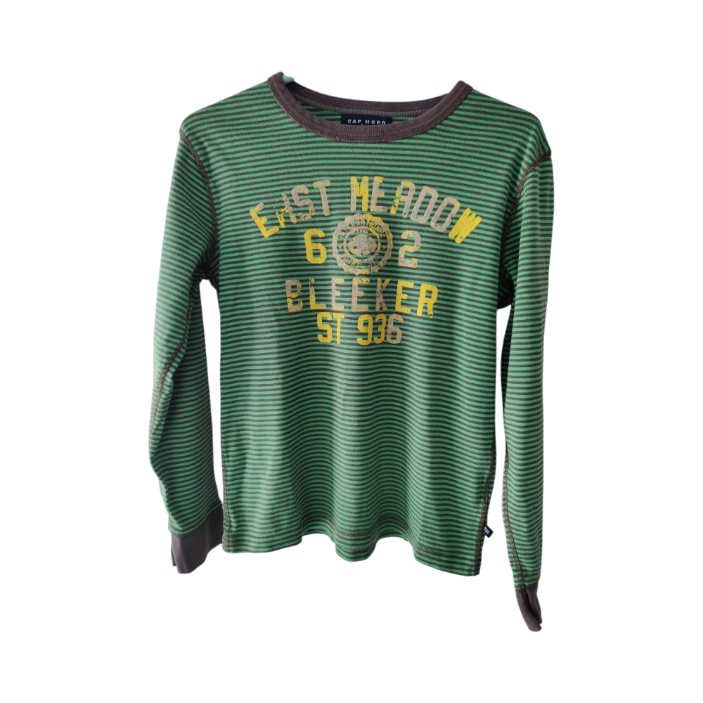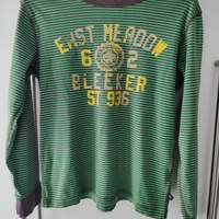 Vihreä-ruskeat raidat, painatus edessä, pitkähihainen. Muutaman kerran vain käytetty.