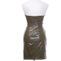 Olkaimeton, vartalonmyötäinen vinyylimekko, kiiltävä pinta.