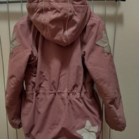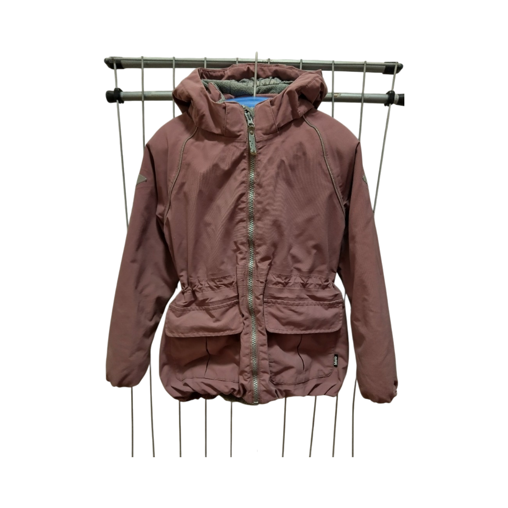 Liilanvärinen Molo-takki fleecevuorella kokoa 122 (pieni mitoitus). Kunto OK, joitakin käytön jälkiä löytyy (ks. kuvat). Kestää hyvin kosteutta ja likaa.
