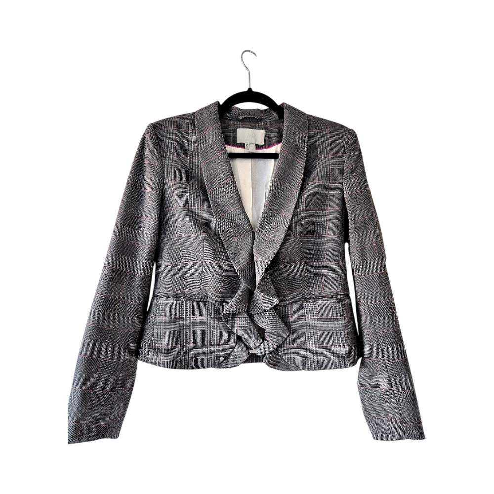 Tyylikäs harmaa ruudullinen bleiseri rypytyksellä ja ruutukuviolla. Koko pieni 38.