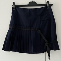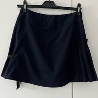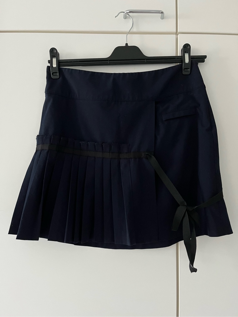 Tummansininen hame mustalla nauha yksityiskohdalla. Sivulla piilovetoketju, toinen puoli helmasta vekitetty ja vasemmalla puolella hametta pieni vetoketjullinen tasku. Koko S ja menee mielestäni myös M kokoiselle. Siistissä kunnossa ulkoa mutta sisäpuolella kangas nukkaantunut