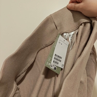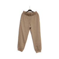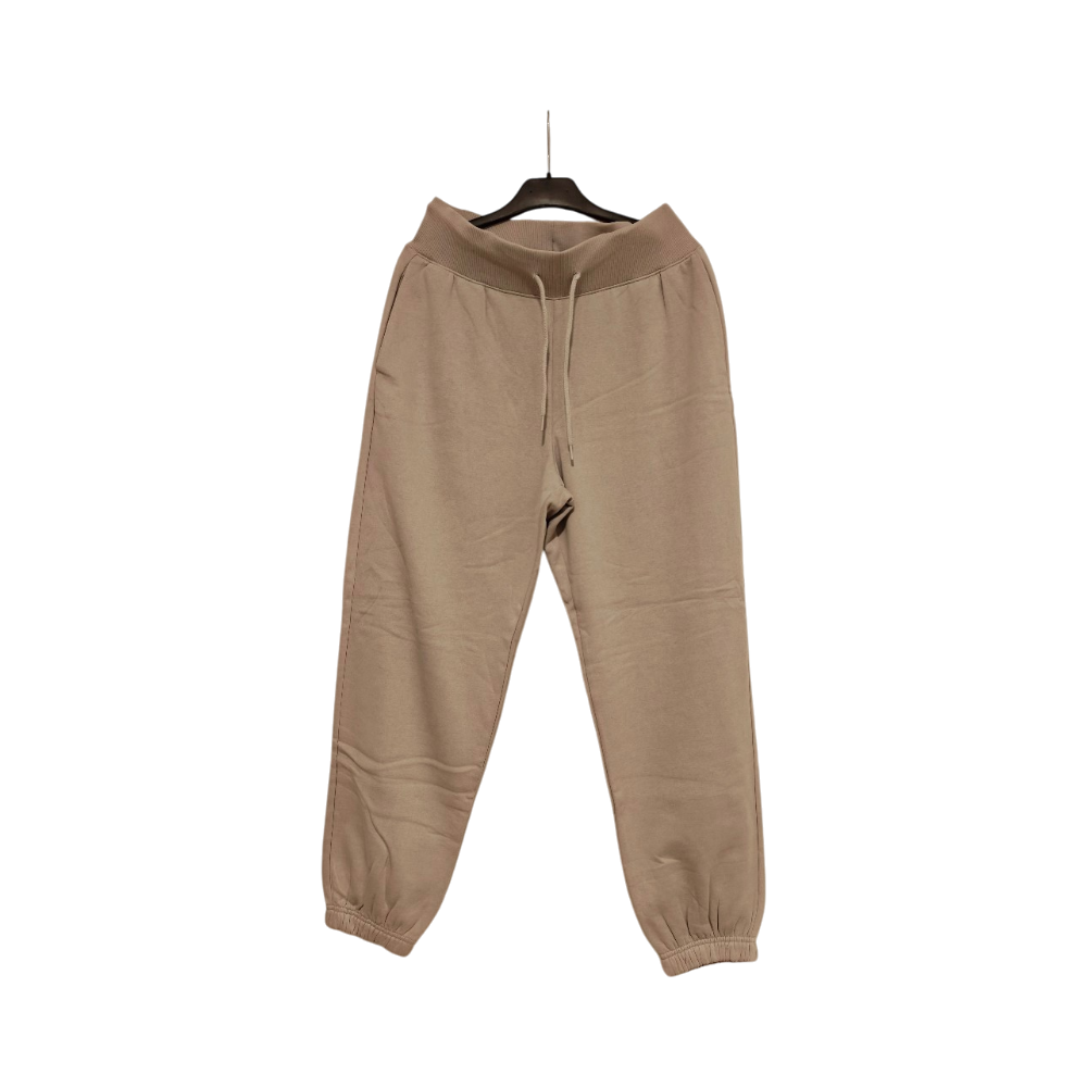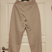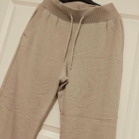 Korkeavyötäröiset vaalean nuden/harmaanbeigen sävyiset joggersit.