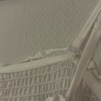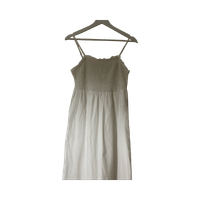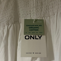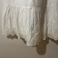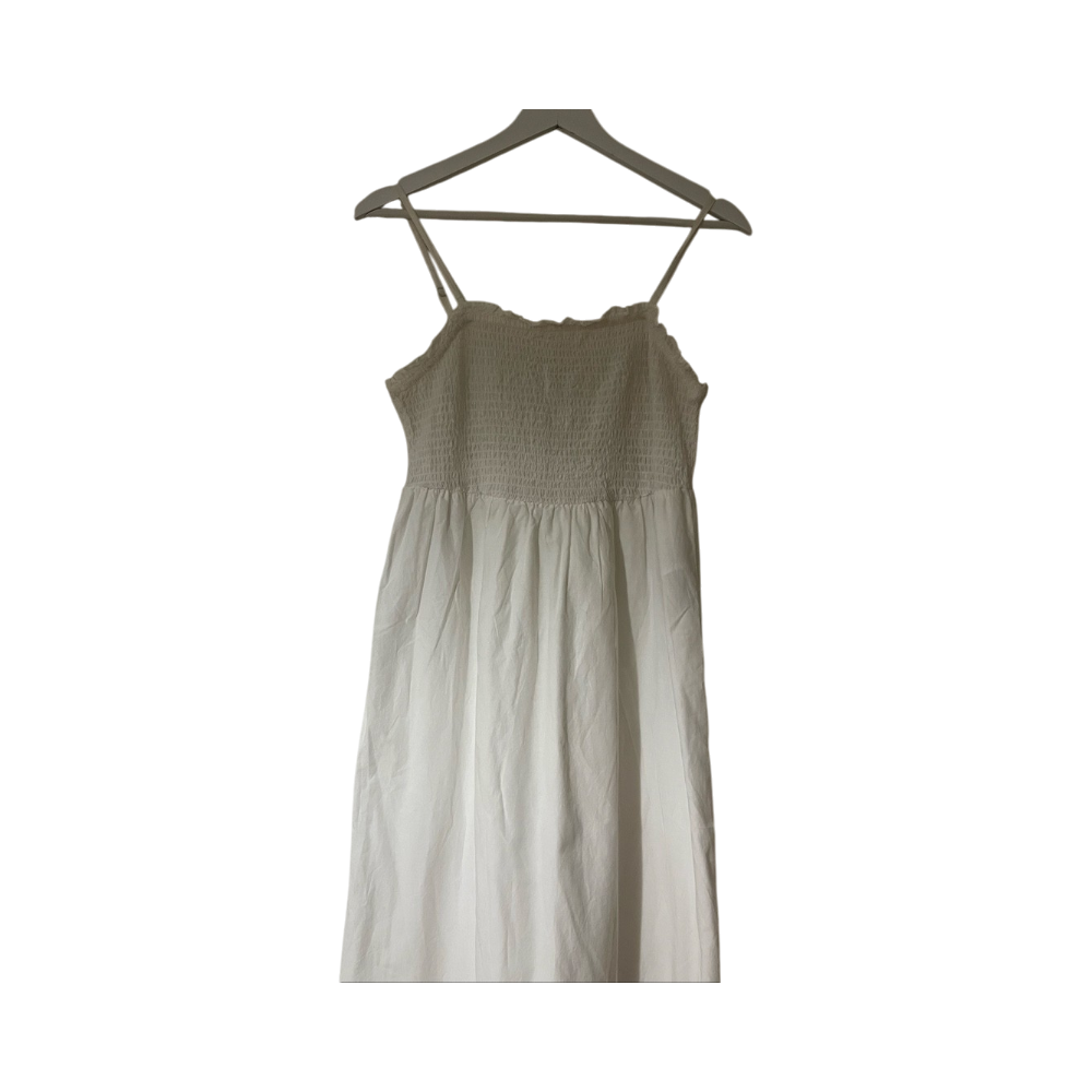 Valkoinen smock-mekko brodeerauksella helmassa.