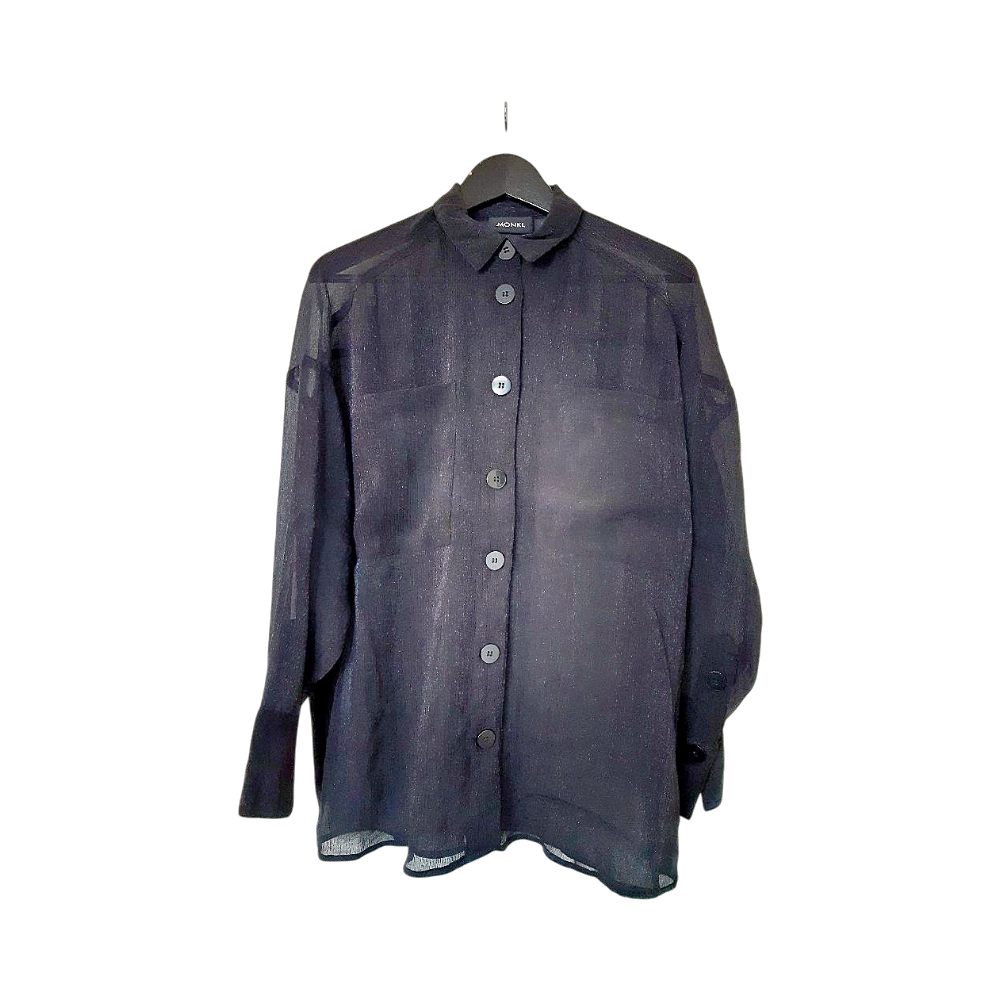 Monkin musta kauluspaita. Napitus kaulasta helmaan. Ohutta ja läpinäkyvää kimaltelevaa kangasta, joten kiva paita vaikka juhliin. Hihoissa napit. Edessä kaksi rintataskua. Oversize-mallia. Koko XS, sopii hyvin S-M-kokoiselle. Kainalo-kainalo 60 cm, olkapää-helma 73 cm. Materiaali 70% polyesteria ja 30% polyamidia.