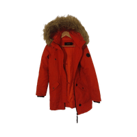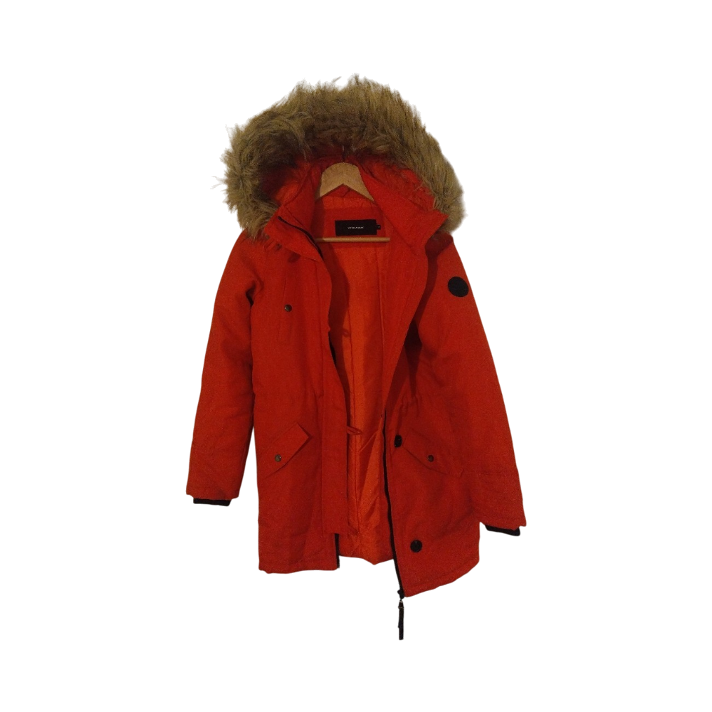 Lämmin naisten parkatakki huppu karvareunuksella.