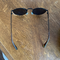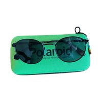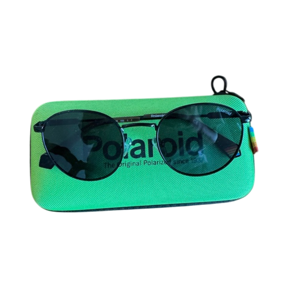 Classic round sunglasses from Polaroid with slim black metal frames and polarized dark lenses. Lightweight design with subtle branding on the temples and rainbow detail on the earpieces. Includes original bright green Polaroid hard case.