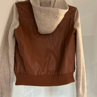 Ruskea keinonahkainen huppari, beiget hihat ja huppu.