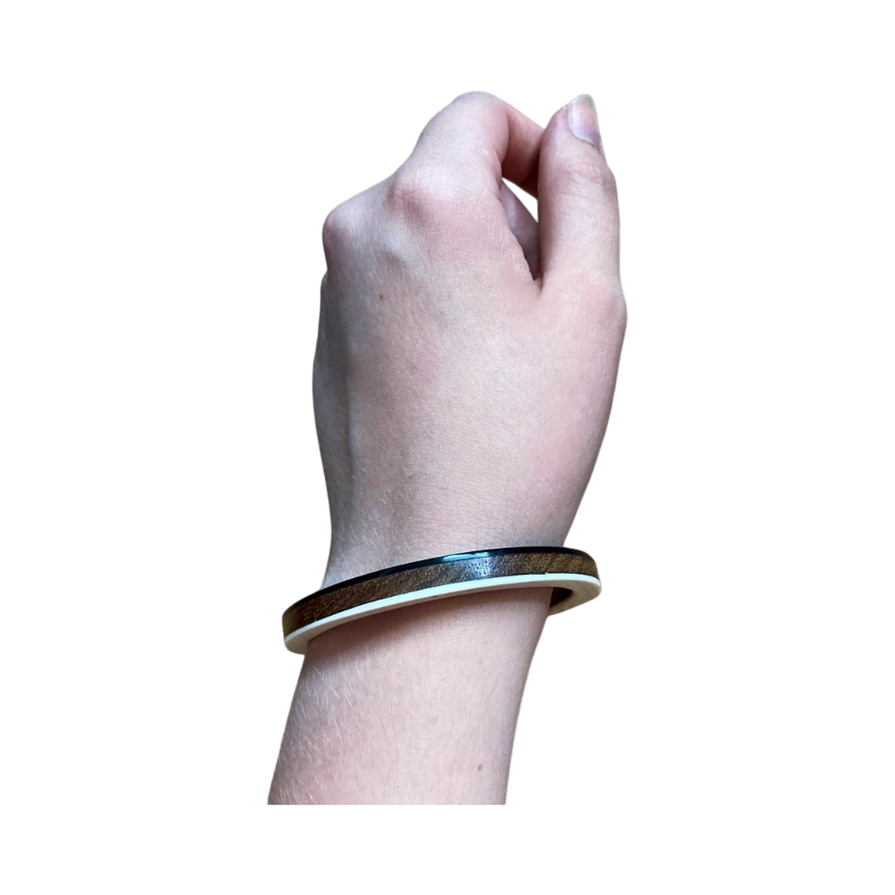 Toinen puoli musta ja toinen valkoinen. Keskeltä ruskeaa puuta.