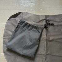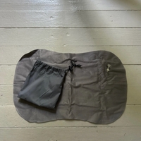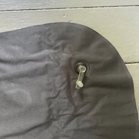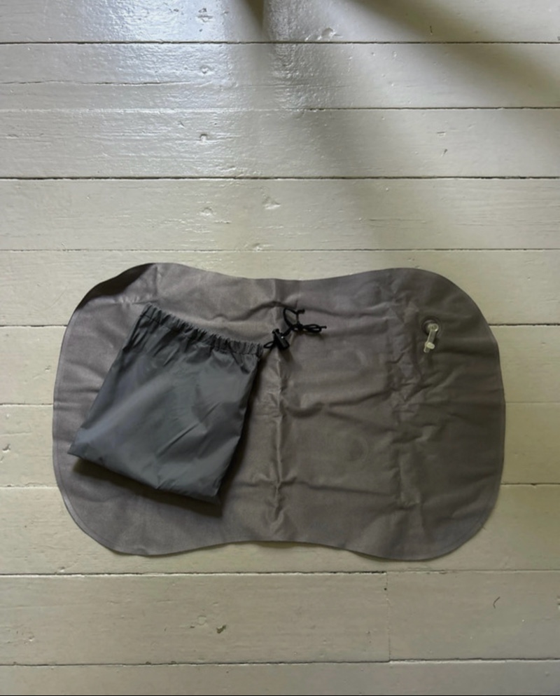 Foldable grey inflatable travel pillow cover with storage pouch.