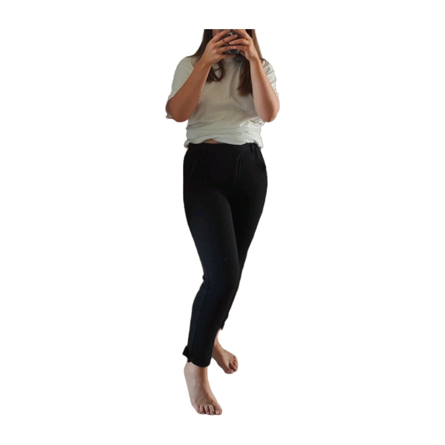 Toiseen lahkeen taitos hieman purkautunut, tarkoittaen, ettei lahkeet pysy niin hyvin suorina. Itse olen käyttänyt näitä käärittynä, jolloin lahkeen purkauma ei ole haitannut. Jos haluat käyttää näitä käärimättä, taitos on helppo korjata muutamalla ompeleella! :)