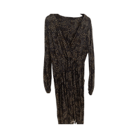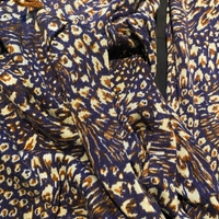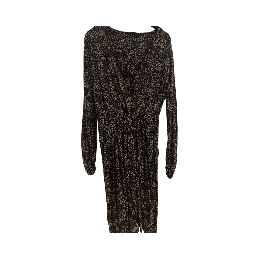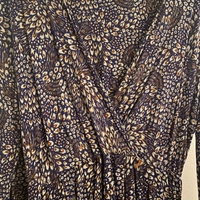 Kauniskuvioinen mukavan tuntuinen viskoosimekko V-kauluksella. Pitkät hihat ja kauniit laskokset. Ehjä ja tahraton.