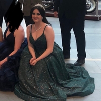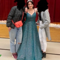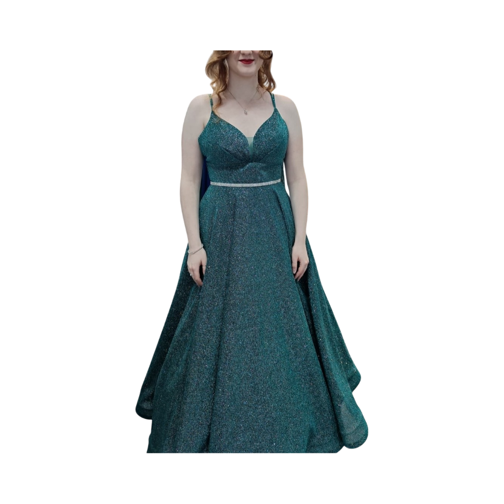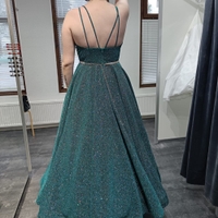 Kerran käytetty kimalteleva ja vihreä wanhojen mekko. Sopii S-L kokoiselle, takana lisätty nyöritys. Mukaan tulee kimalteleva vyö. Olen 164cm, tanssin ilman korkoja niin ylti sopivasti lattiaan.