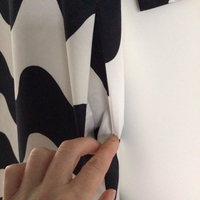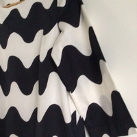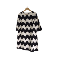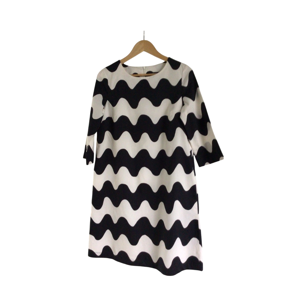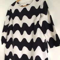 Marimekon musta-valkoinen Biak pikkulokki kokoa 36. Second handinä hiljattain kotiutunut, ei moitteita mutta itselle liian iso. Malli a-linjainen, taskut sivuilla ja valkoinen vuori, hihoissa ei vuorta ja hihat 3/4. Kainalo-kainalo n. 46cm, pituus n. 93cm ja helma n. 60. Ihan himppusen pesunukkaa siellä täällä.