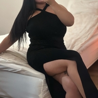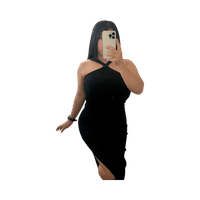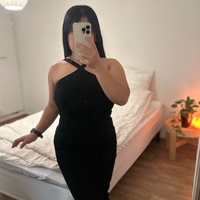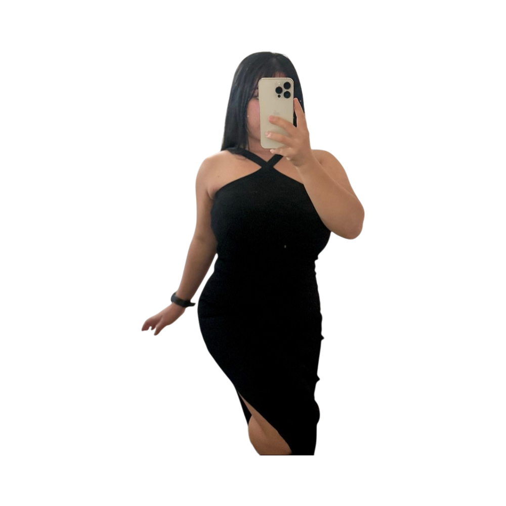 Pitkä musta mekko, ristiolkaimet ja halkio sivussa.