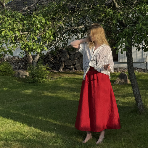 A-linjainen juhlamekko, ruusukuvioitu yläosa, satiininen helma.