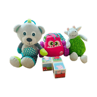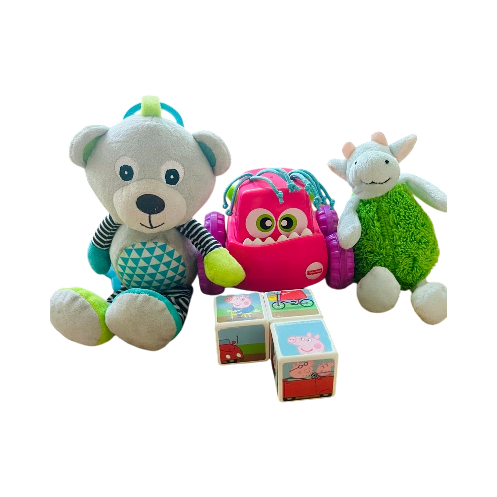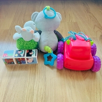 Bed hanging dolls, toy cars, dolls, magnetic toys Peppa Pig, from left to right.