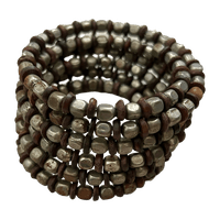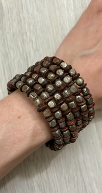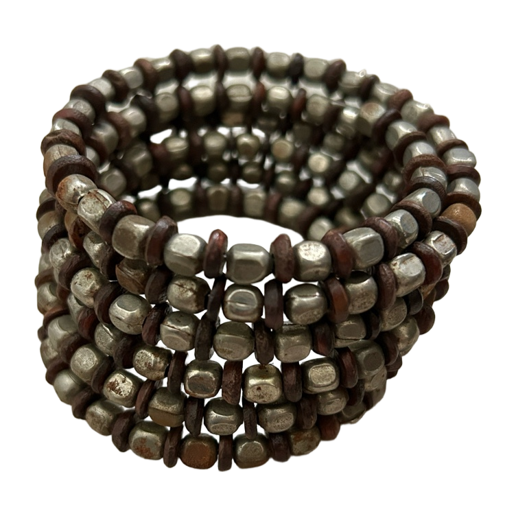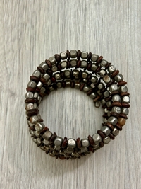 Monirannekoru metallikuulilla ja puuhelmillä, joustava malli.