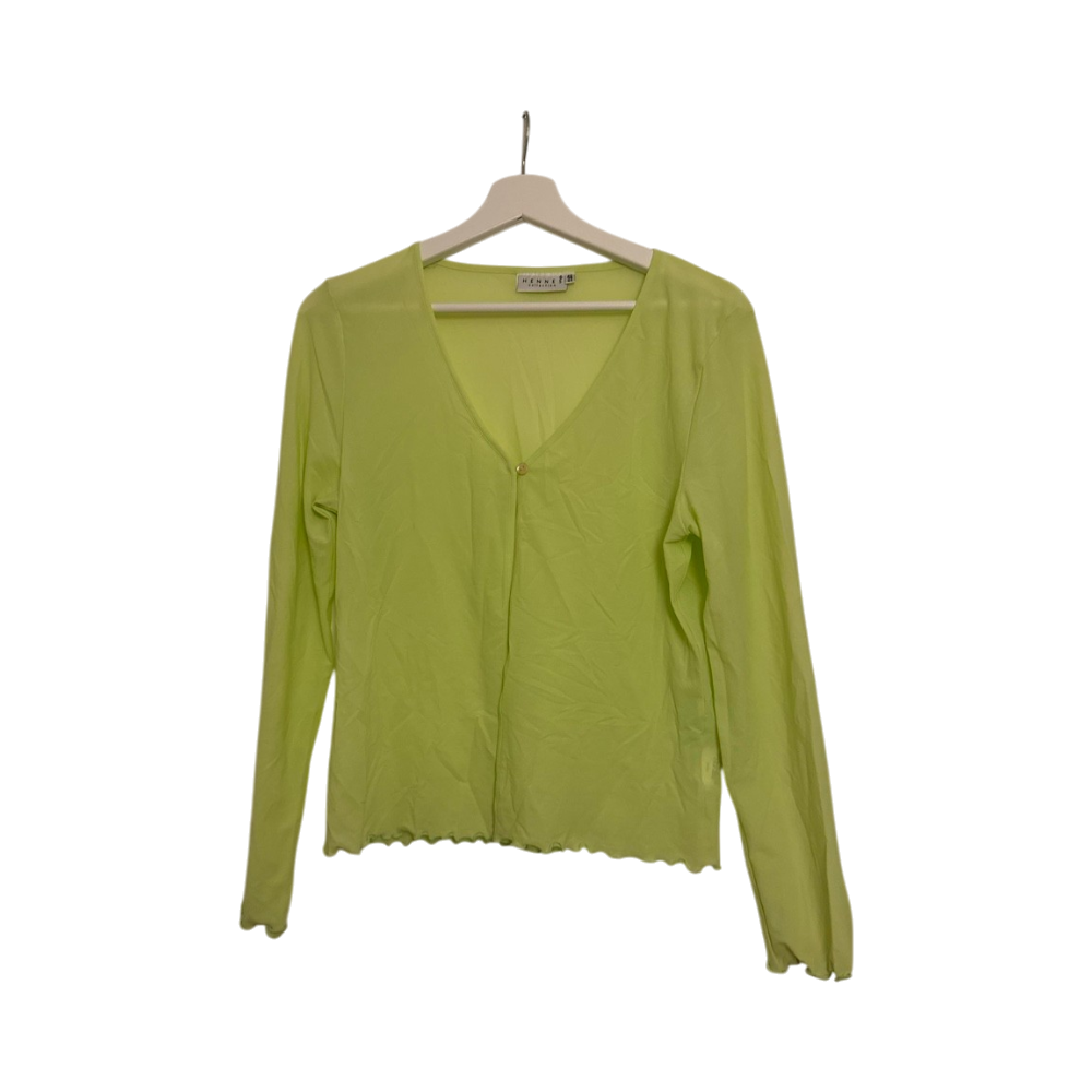 Ohut V-kaula‑neule, pyöristetyt reunat, yksi nappi edessä.