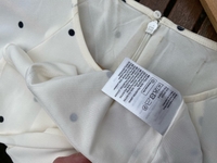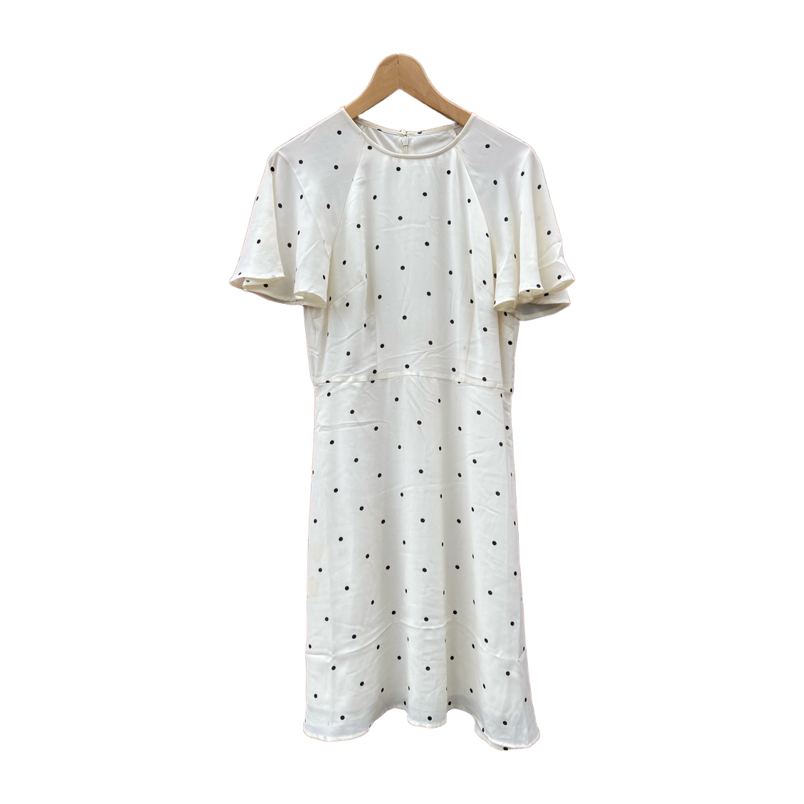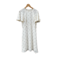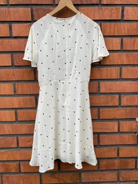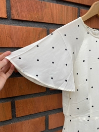 Valkoinen mekko mustilla pilkuilla, lyhyet perhoshihat, vetoketju takana.