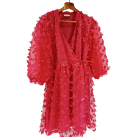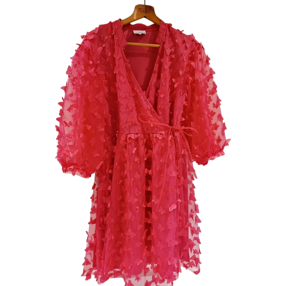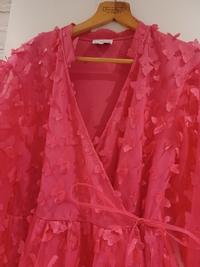 Kerran käytetty Pinkki L kokoinen perhosmekko. Harmikseni iso minulle,on hieman reilua mitoitusta. Kietaisumekko jonka Kainalo-kainalo on n.55cm ja olka-helma n.95cm. Hiat läpikuultavaa kangasta ja muissa kohdissa Pinkki Kangas alla.