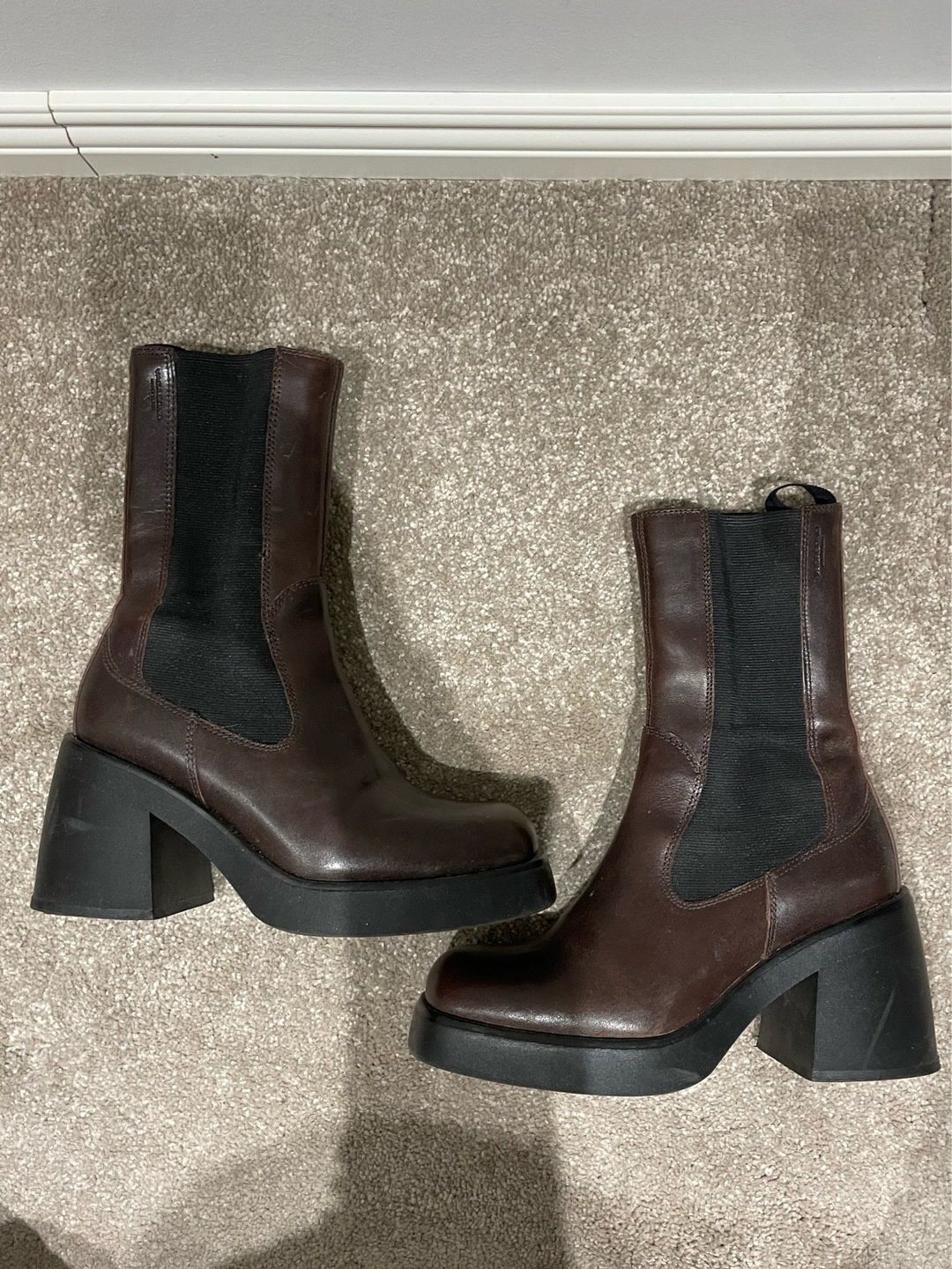Vagabondin korkokengät. Koko on 36. Tukeva ja hyvä korko. Nahka on tumman punertavan ruskea. Nilkan kohdalla on joustoa niin, että saa vedettyä jalkaan. Ei vetoketjua. Maksoivat uutena 170€.
