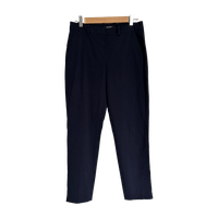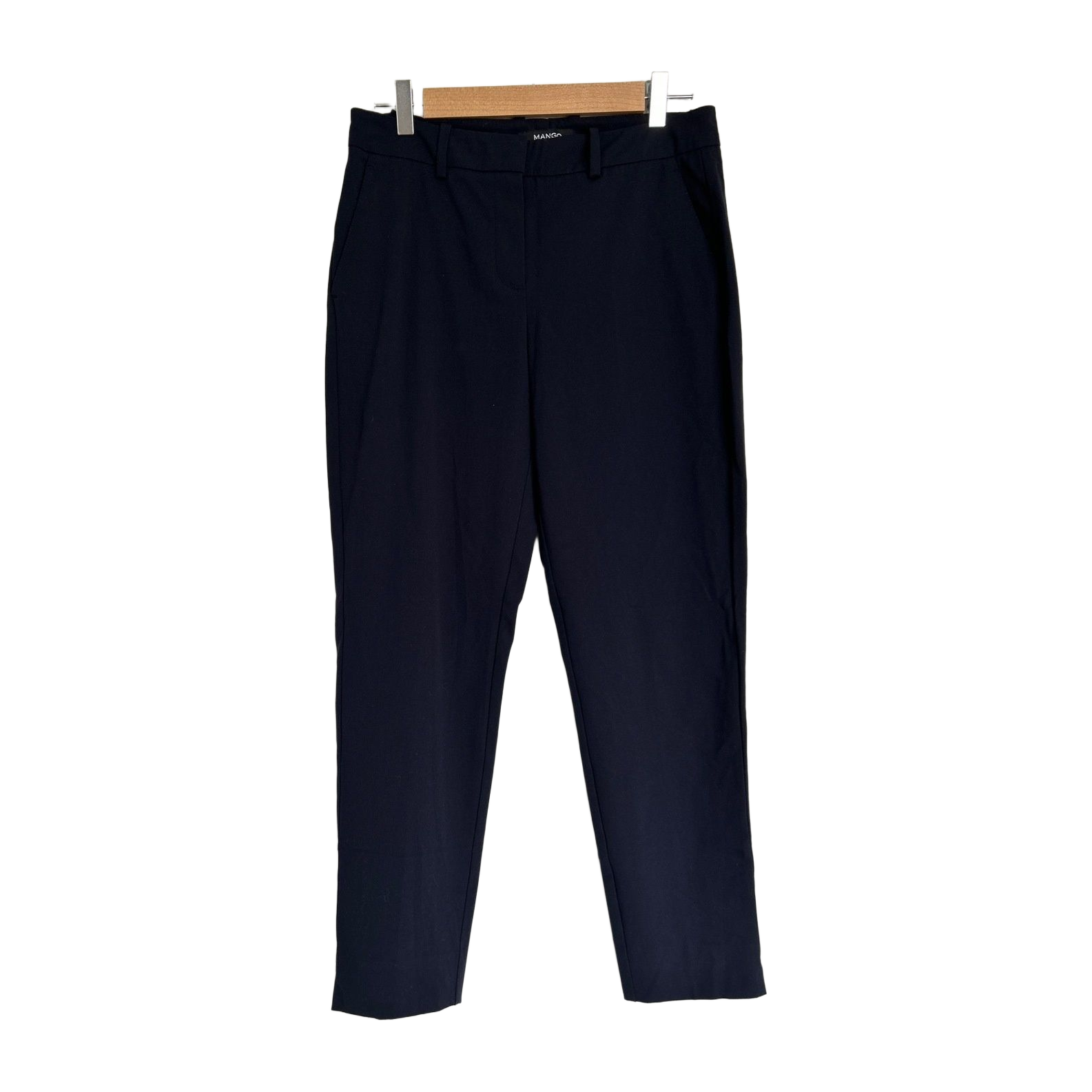 Mangon tummansiniset housut kapenevalla lahkeella, koko 36. Vyötärön ympärys n. 78cm ja lahkeen sisämitta n. 70cm.