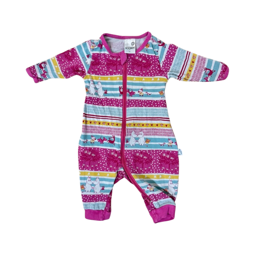Suloinen Moomin-kuvioitu vetskaripyjama vauvalle. Hyväkuntoinen.
