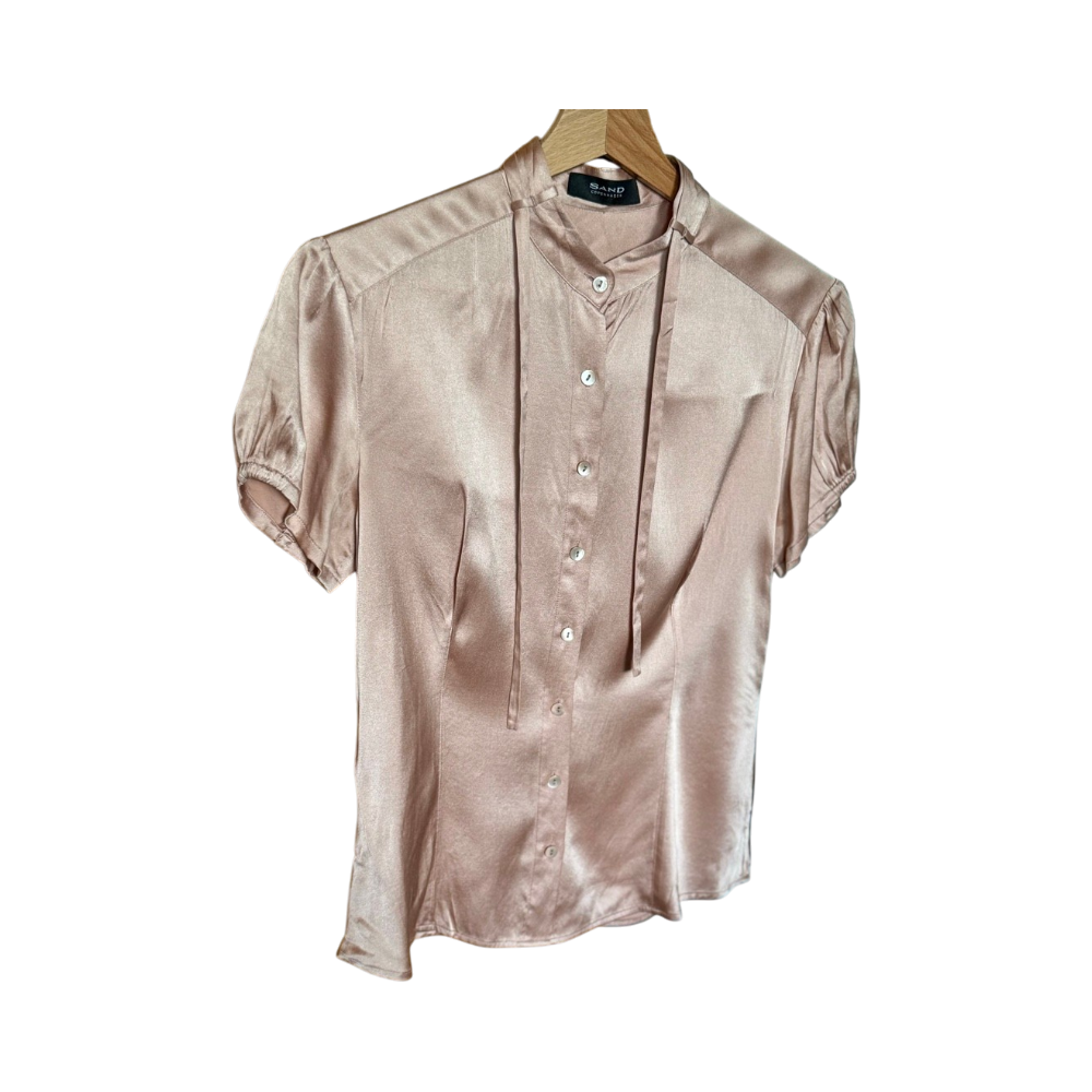 Short-sleeve pink satin button-up blouse with tie neckline.