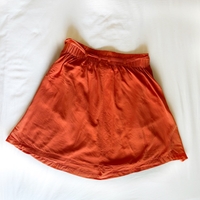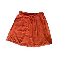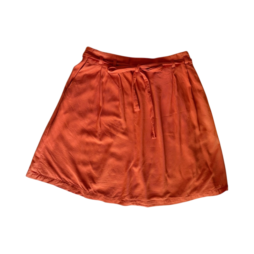 Oranssi A-linjainen midihame, kuminauhavyötärö ja taskut.