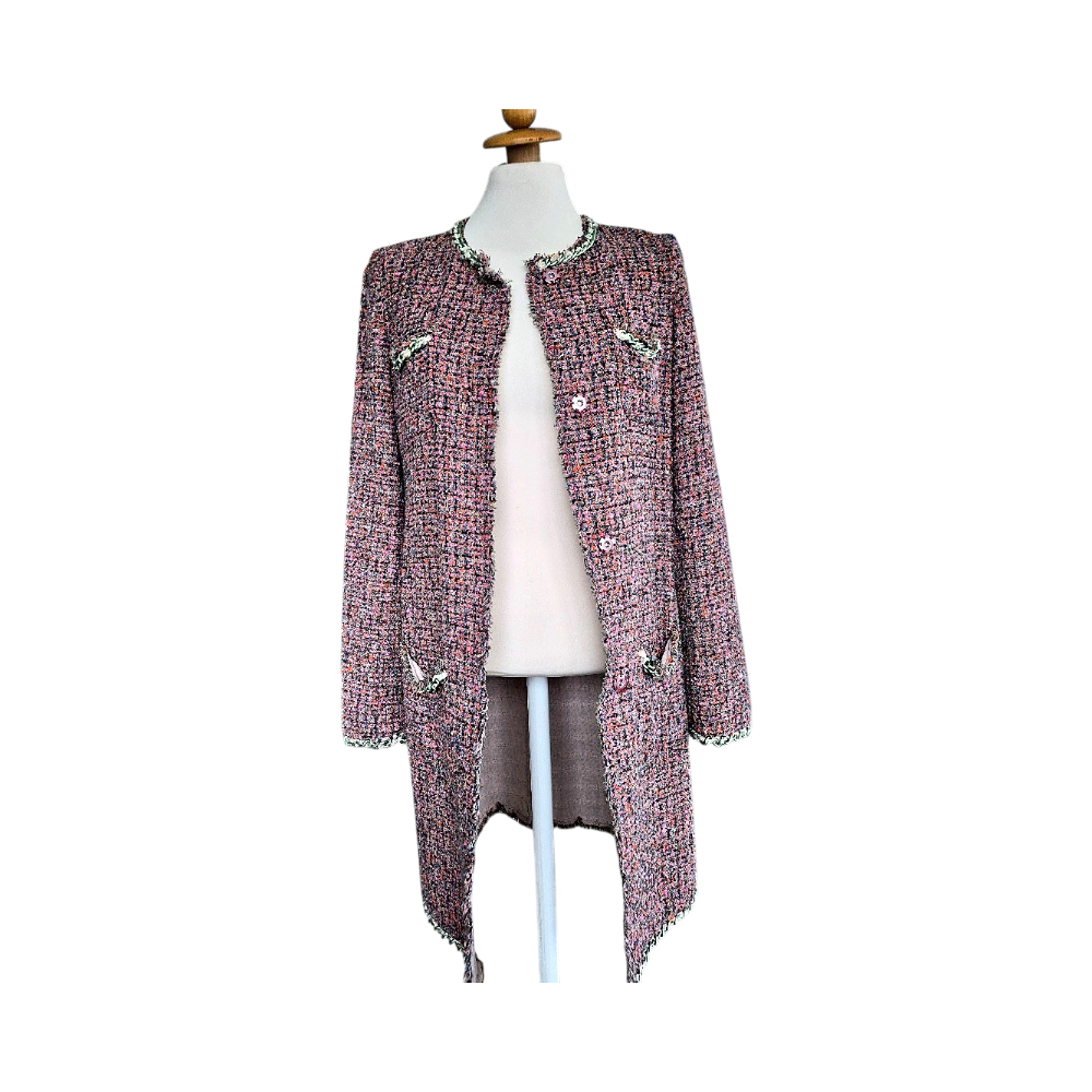 Elegant D&G Dolce & Gabbana long tweed coat in a beautiful multicolour weave (pink, orange, blue tones).
