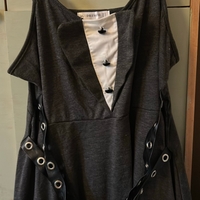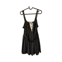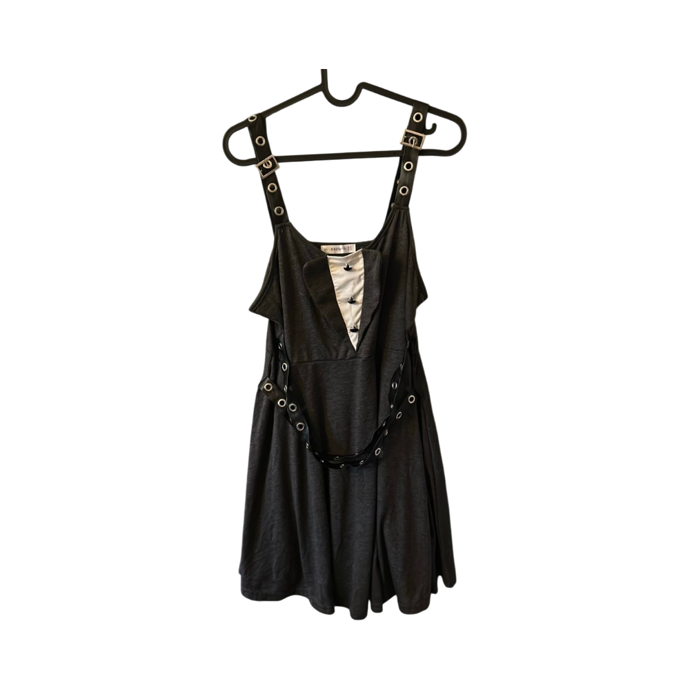 Musta vekkihameinen mekko, valkoinen rintapaneeli ja remmit.