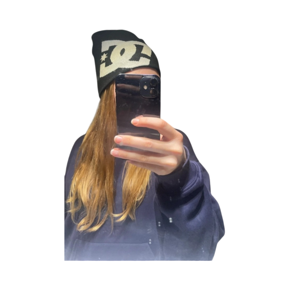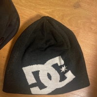Black knit beanie with large contrasting DC logo, one-size. Oon pelkästään kokeillu, en käyttänyt kunnolla.