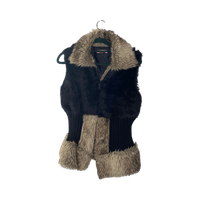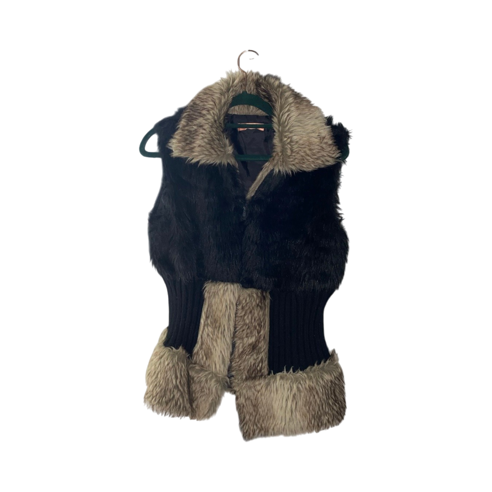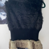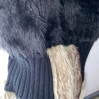Lyhyt musta tekoturkisliivi, vyötäröllä ribbineulos ja beige reunus.
