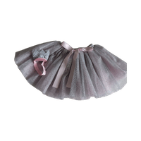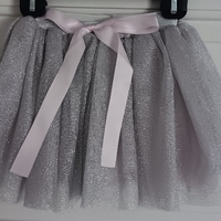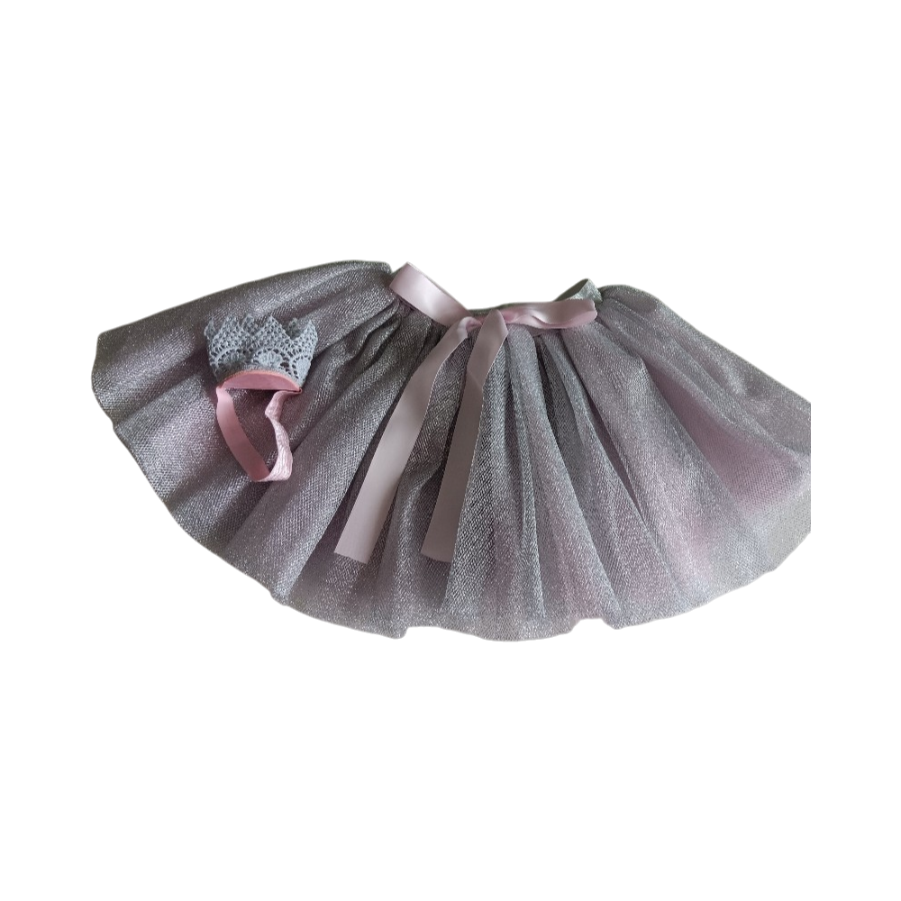 Helmenharmaa/vaaleanpunainen tyllihame satiininauhalla & hopeaglitterillä. Mukana harmaa pitsimäinen kruunu joustavalla kuminauhalla. Täysin käyttämätön. Sopii juhlamekoksi tai naamiaisasuksi/ leikkeihin.