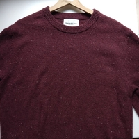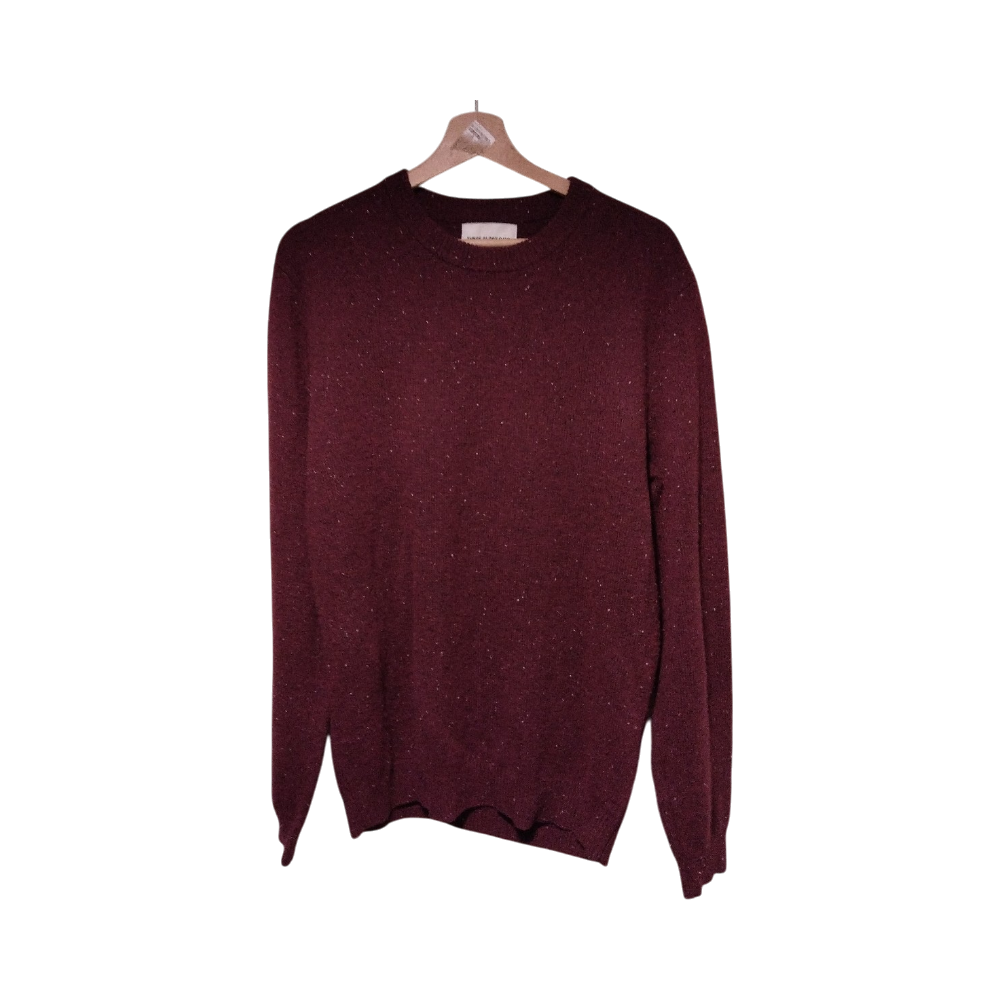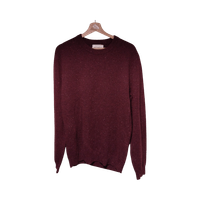 Miesten pyöreäkauluksinen, viininpunainen neulepusero. Lampaanvilla, nylon.