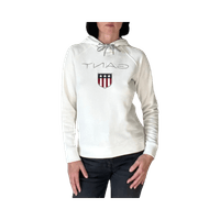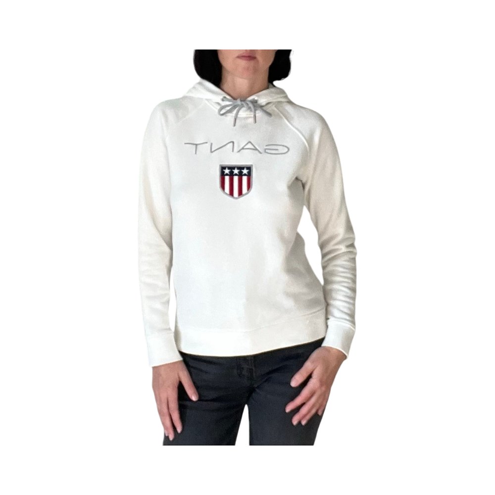 Naisten valkoinen huppari, edessä kilpimerkki ja GANT-logo. XS koko. Hyvä kunto. Malli on 162 cm pitkä. Nouto Helsingistä mahdollinen.