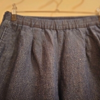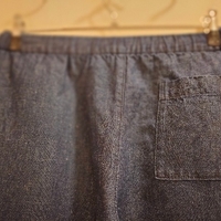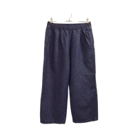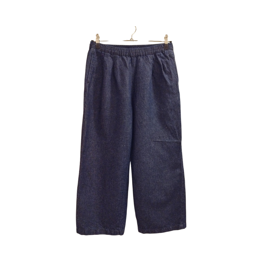 Puuvilla-pellavsekoitteiset, nilkka pituiset, tummansiniset housut kokoa M. Housuissa vyötärökaitaleesta laskeutuvat laskokset ja sivutaskut, sekä yksi takatasku. Vyötärökaitaleessa kuminauha ja kiristysnyörit. Kangas farkkukankaan tavoin kudottu. Harhaostos. Käytetty kerran. Koiratalous. Voidaan sopia myös noudosta akselilla Kerava-Korso.