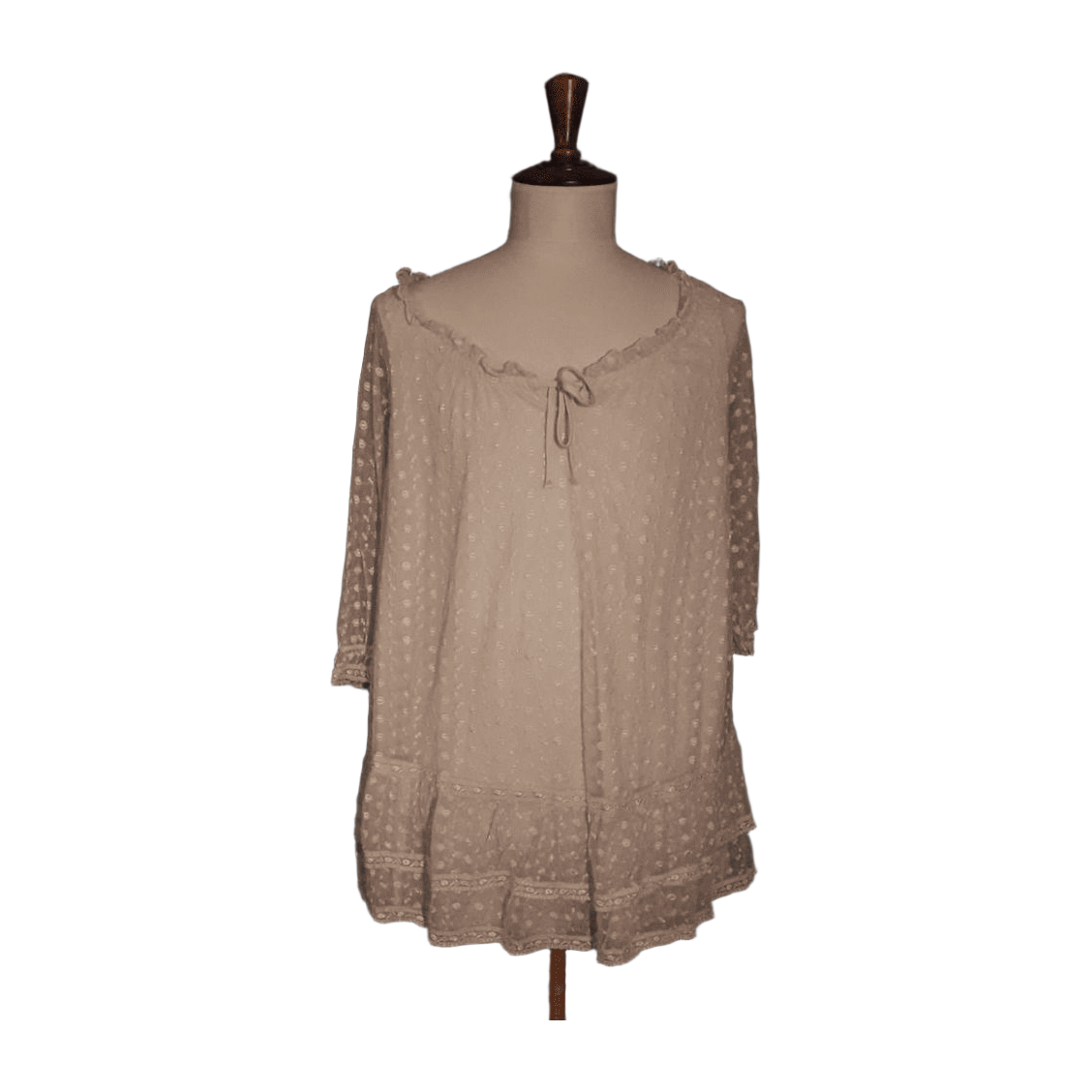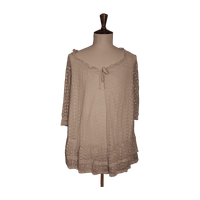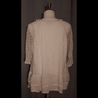 Valkoinen, vuorellinen tunika. Ohut, läpikuultava päällyskangas polyesteri pitsiä, vuorittomat hihat. Avarassa kaula-aukossa kiristysnyöri. Hyvässä käytetyssä kunnossa.