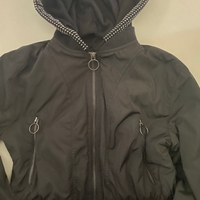 Lyhytmallinen pomper takki, iroitettava huppu, huppu on vähän painava johtuen bling koristeista. Koko L mutta menee hyvin koko M.