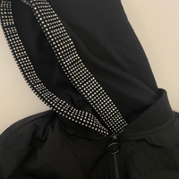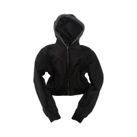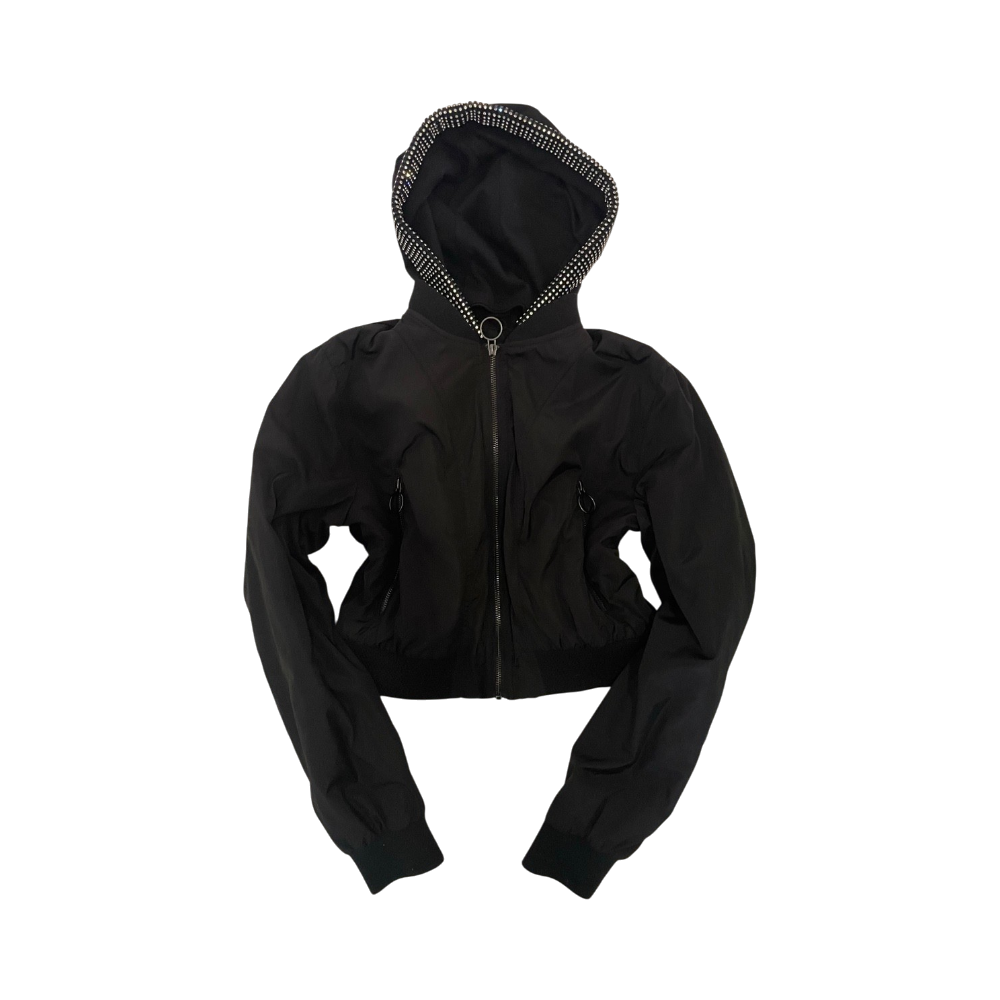 Mustaa toppimaista takkia, hupussa koristekivet rivissä.